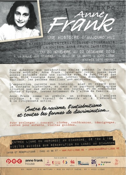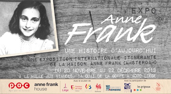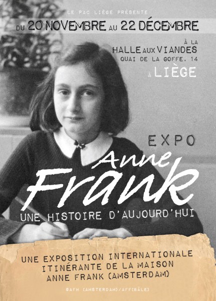 Anne Frank était une adolescente juive qui a vécu cachée dans une maison d'Amsterdam durant la Shoah pour tenter d'échapper aux nazis. Elle a raconté son histoire dans son journal qui sert de fil conducteur à l'exposition "Anne Frank, une histoire d'aujourd'hui". Coordonnée par "La Maison d'Anne Frank", cette exposition internationale a déjà été vue par 20 millions de visiteurs dans le monde et sera présentée à Liège par la Régionale PAC (Présence et Action Culturelles) de Liège, du 20 novembre au 22 décembre 2013 à la Halle aux viandes de Liège.