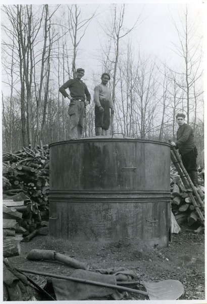 « Un à deux jours plus tard, les hommes se chargent du défournement à la nuit tombée […] Ils commencent par ôter […] un quartier de la faude »[13] en récupérant les charbons produits par la combustion qu'ils empilent non loin. Le conditionnement se faisait dans des sacs de jute. Cette combustion à l'étouffée se poursuivra jusqu'au début du XXe siècle avec des « […] fours portatifs à anneaux, posés sur le sol, telles de grosses cloches ».[14] Modernisée, elle sera utilisée jusqu'à la moitié des années trente.