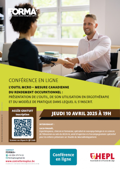 Publié le 04-04-2025 La HEPL et FORMA+ organisent la conférence en ligne "L'outil MCRO - Mesure Canadienne du Rendement Occupationnel" le jeudi 10 avril à 19h.