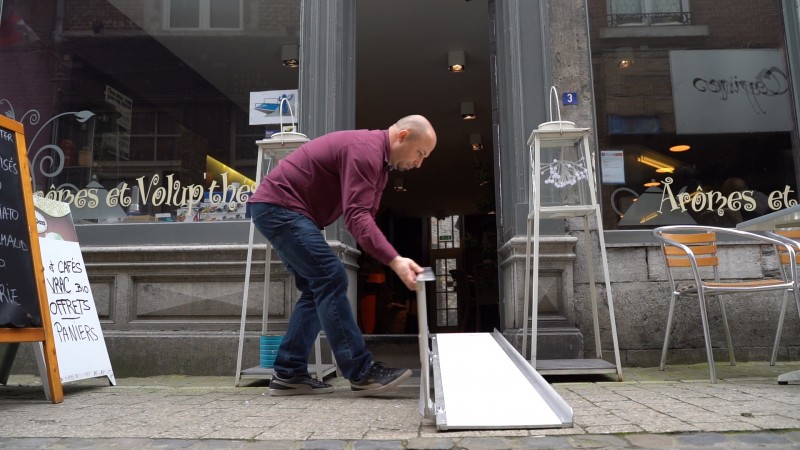 A Huy, le salon de dégustation « Arômes et Volup'thés » a été confronté dès le début à la problématique de l'accessibilité avec des clients réguliers se déplaçant en chaise roulante. Venceslas Viseur, le patron de l'établissement, s'est porté volontaire pour le projet pilote de la Province lancé en 2017 afin de dégager une solution. « Une rampe amovible, facilement transportable, sous forme d'une valise qui s'ouvre en deux et que l'on vient apposer à l'entrée afin d'effacer totalement la marche. C'est une amélioration très intelligente qui permet d'accueillir le plus grand nombre. »