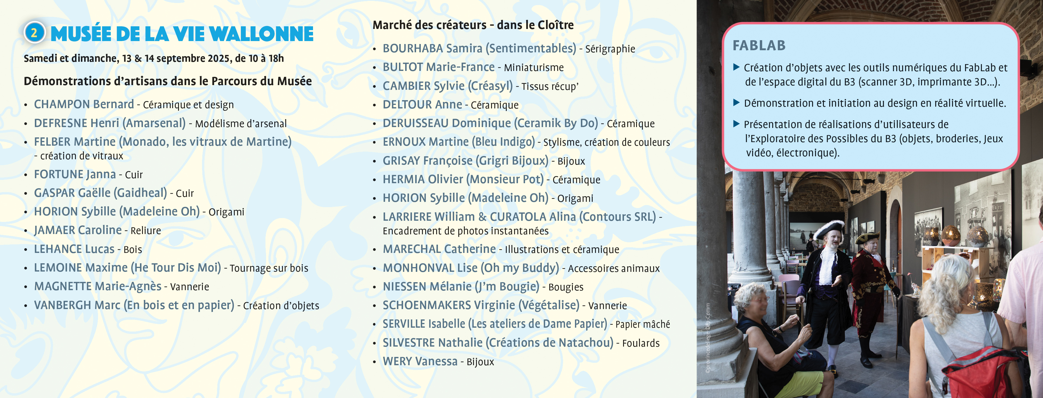 - Lieux principaux : Palais provincial (Place Saint-Lambert, 18A) & Musée de la Vie wallonne (Cour des Mineurs)